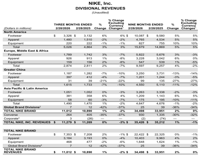 3月31日,耐克集團發(fā)布了2026財年第三季度財報。截至2026年2月28日,集團營收為113億美元(約合人民幣778.44億元),同比持平;凈利潤同比大跌35%至5.2億美元(約合人民幣35.82億元);毛利率同比下降1.3個百分點至40.2%,已連續(xù)六個季度下跌。