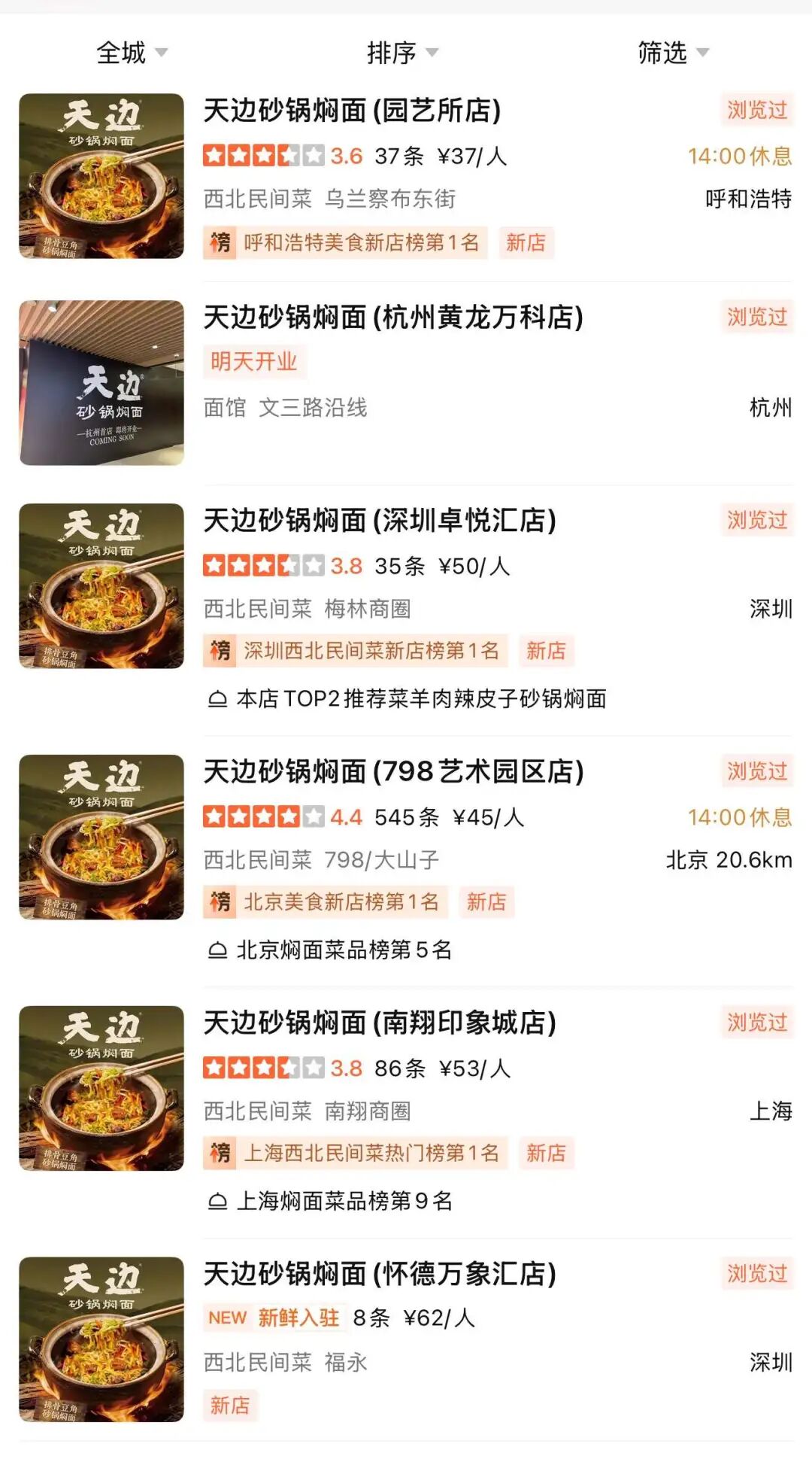 近期,西貝副牌“天邊砂鍋燜面”密集拓新店,陸續(xù)在北京、呼和浩特、上海、深圳開(kāi)出5家門(mén)店,大眾點(diǎn)評(píng)顯示,全國(guó)第六店(杭州黃龍萬(wàn)科店)預(yù)計(jì)在4月6日開(kāi)業(yè)。