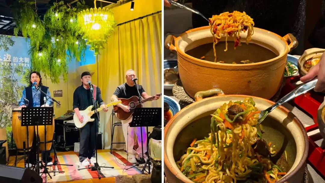 和以往的副牌不同,天邊砂鍋燜面是徹徹底底的“去賈國(guó)龍化”。品牌名字和LOGO里再?zèng)]有賈國(guó)龍或西貝的標(biāo)識(shí),裝修風(fēng)格也拋掉了高辨識(shí)度的“紅格子桌布”,而是采用了迎合當(dāng)前消費(fèi)風(fēng)向的“粗糲山野風(fēng)”,甚至還邀請(qǐng)了河套當(dāng)?shù)氐膿u滾樂(lè)隊(duì)駐場(chǎng)。