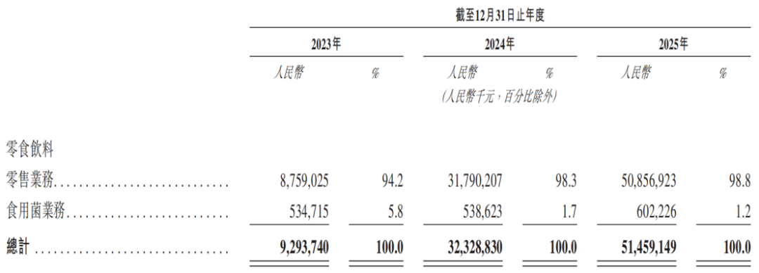 更新后的招股書(shū)顯示,萬(wàn)辰集團(tuán)的業(yè)務(wù)結(jié)構(gòu)已發(fā)生根本性重塑。2025年,零食飲料零售業(yè)務(wù)收入為508.57億元,占營(yíng)收的比例高達(dá)98.8%,成為絕對(duì)的收入支柱。而曾經(jīng)的核心業(yè)務(wù)食用菌業(yè)務(wù)收入占比僅為1.2%,徹底淪為邊緣業(yè)務(wù)。這意味著,萬(wàn)辰集團(tuán)已基本剝離食用菌業(yè)務(wù),完成了從“食用菌第一股”到零食巨頭的身份切換。