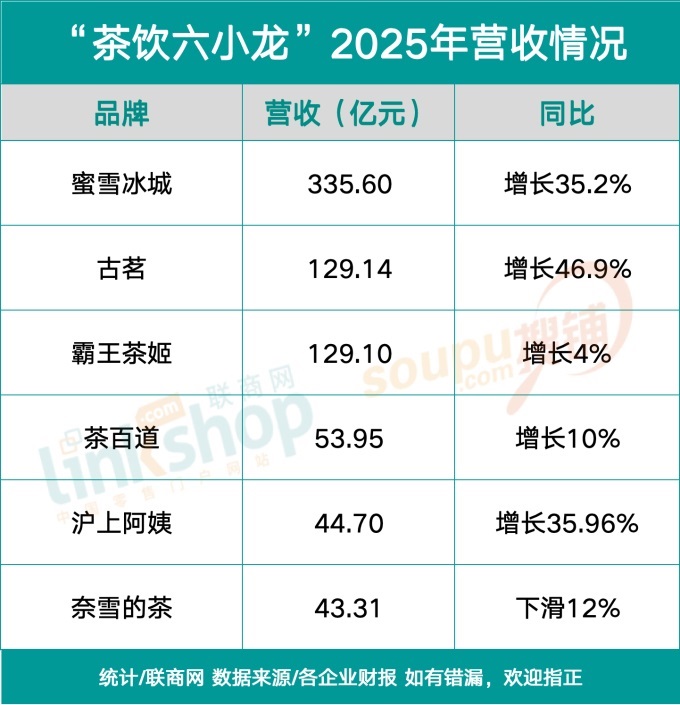 尤其是隨著蜜雪冰城、古茗、霸王茶姬、茶百道、滬上阿姨、奈雪的茶這六家上市企業(yè)2025年財(cái)報(bào)全部出爐,一幅冰火兩重天的行業(yè)版圖非常清晰地呈現(xiàn)在消費(fèi)者面前。