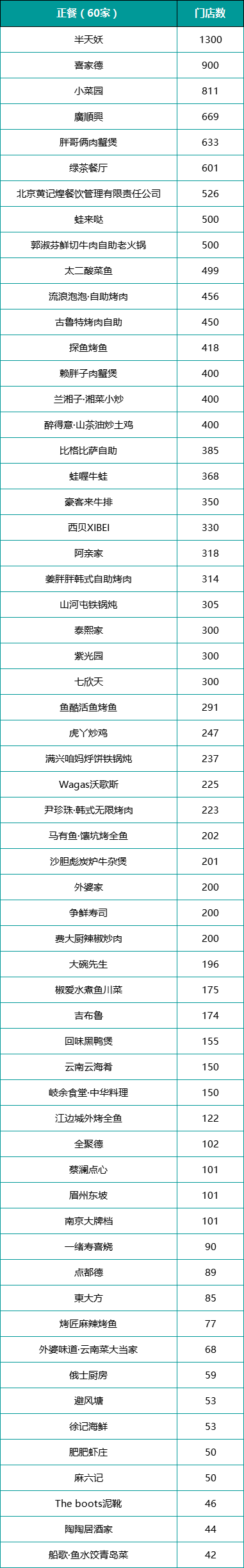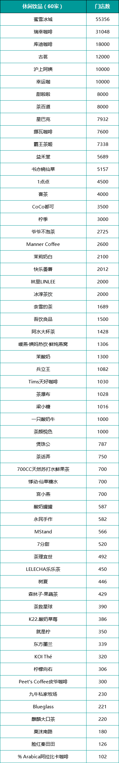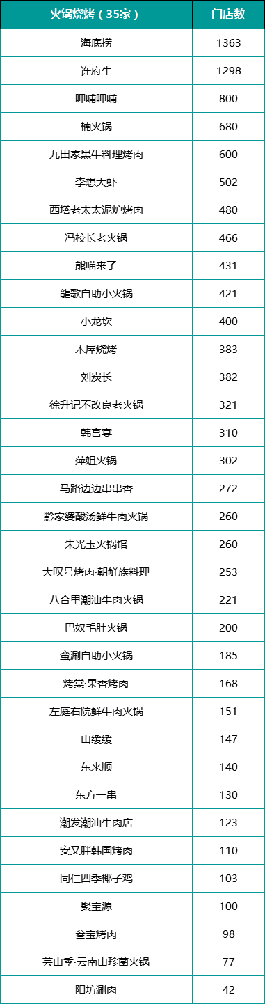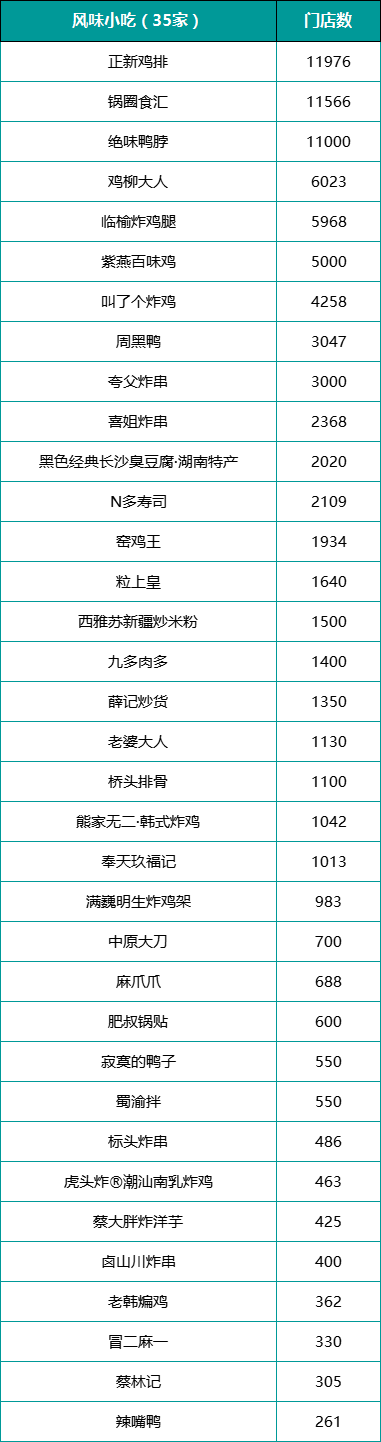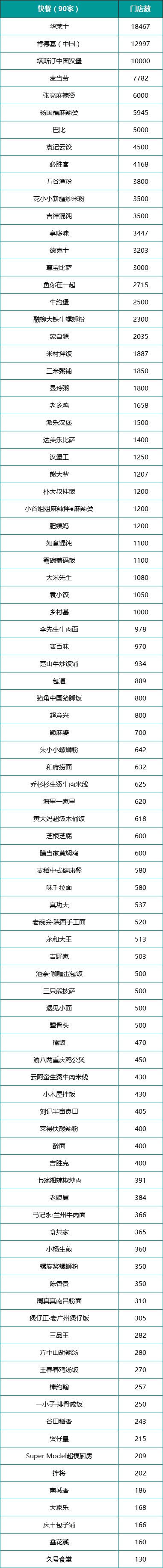 最終TOP300顯示,拔得正餐類前三的分別是半天妖(門店數(shù)為1300家)、喜家德(900家)、小菜園(811家);快餐類華萊士(18467家)、肯德基中國(guó)(12997家)、塔斯汀中國(guó)漢堡(10000家);火鍋燒烤類海底撈(1363家)、許府牛(1298家)、呷哺呷哺(800家)。而飲品類前三為蜜雪冰城(55356家)、瑞幸咖啡(31048家)、庫迪咖啡(18000家)。