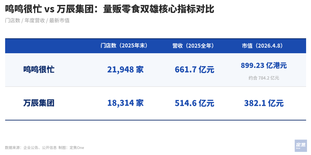 兩份財報放在一起看,行業(yè)規(guī)模還在狂奔。2025年,鳴鳴很忙以21948家門店、661.7億元營收登頂,萬辰集團以18314家門店、514.6億元營收緊隨其后,二者合計占據(jù)75.5%市場份額。截至4月8日收盤,鳴鳴很忙市值為784.2億元,萬辰集團為382.11億元,不足前者一半。