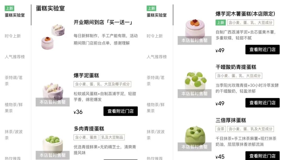 與常規(guī)門店及Lab 2.0門店不同,蛋糕實驗室主要售賣蛋糕和茶飲,以及一些茶點。