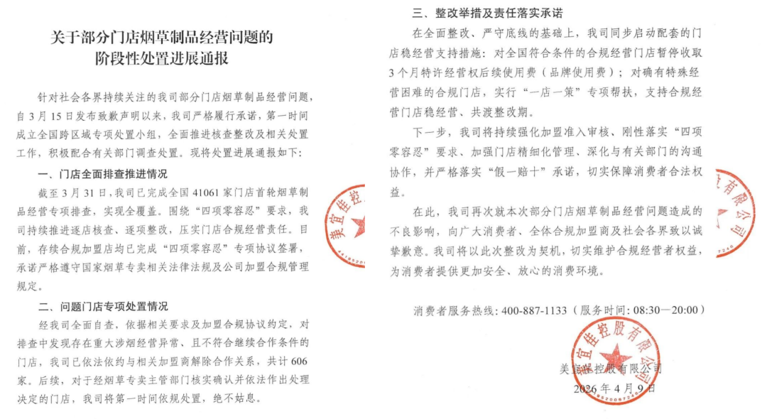通報(bào)顯示,截至3月31日,美宜佳已完成全國(guó)41061家門(mén)店的首輪全覆蓋排查,依法依約解除了606家存在重大涉煙經(jīng)營(yíng)異常門(mén)店的合作關(guān)系,并宣布對(duì)全國(guó)合規(guī)門(mén)店暫停收取3個(gè)月特許經(jīng)營(yíng)權(quán)后續(xù)使用費(fèi),對(duì)特殊困難門(mén)店實(shí)行“一店一策”專(zhuān)項(xiàng)幫扶。