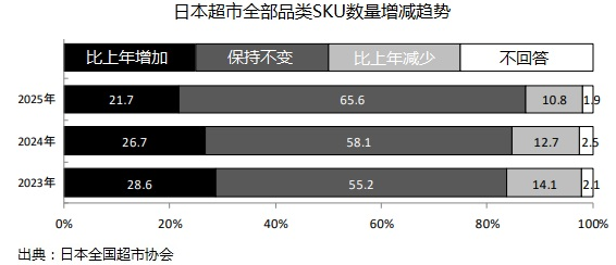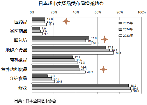 日本超市協(xié)會2025年調(diào)查數(shù)據(jù)顯示,超市經(jīng)營內(nèi)容結(jié)構(gòu)基本穩(wěn)定,同比增加SKU數(shù)量的樣本比例在減少,醫(yī)藥品、烘焙坊面包、營養(yǎng)功能食品有一定增加,其它品類均有所減少,從一個側(cè)面反映出持續(xù)擴大動力不足,與成本效益平衡有一定關(guān)系。