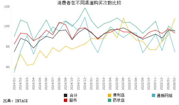 從消費者選擇購買渠道的比較看,在超市、便利店、藥妝店、通販網(wǎng)購比較中,近一年來,藥妝店幾乎一直位居首選位置,超市基本穩(wěn)居第二位,通販網(wǎng)購波動很大,便利店在2024年處于最低選項,2025年有一定的反彈,但是綜合比較始終位于較后的位置。這主要是與價格有直接關(guān)系,藥妝店在確;瘖y品、醫(yī)藥品利潤的前提下,用低價生鮮食品吸引客流量,成為幾大業(yè)態(tài)的競爭強者。