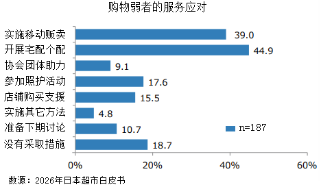 在面向老年客群的服務(wù)方面,日本超市相當(dāng)部分企業(yè)采取相應(yīng)措施,主要有移動販賣和宅配、個體化配送服務(wù)的約占40%。還有采取營養(yǎng)管理師服務(wù)、免費食品配送、購物接送等活動,體現(xiàn)出人性化關(guān)懷。