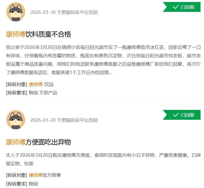 此前據(jù)《1818黃金眼》欄目報道,2025年8月底,杭州一消費者購保質期內康師傅冰紅茶,9月3日飲用時發(fā)現(xiàn)5-6厘米褐色異狀物!昂谪埻对V”平臺顯示,有超過4000條投訴中包含搜索詞“康師傅”,其中除了反映兌獎問題外,還有不少投訴反映康師傅方便面、飲料等產品出現(xiàn)異物等食品安全問題。