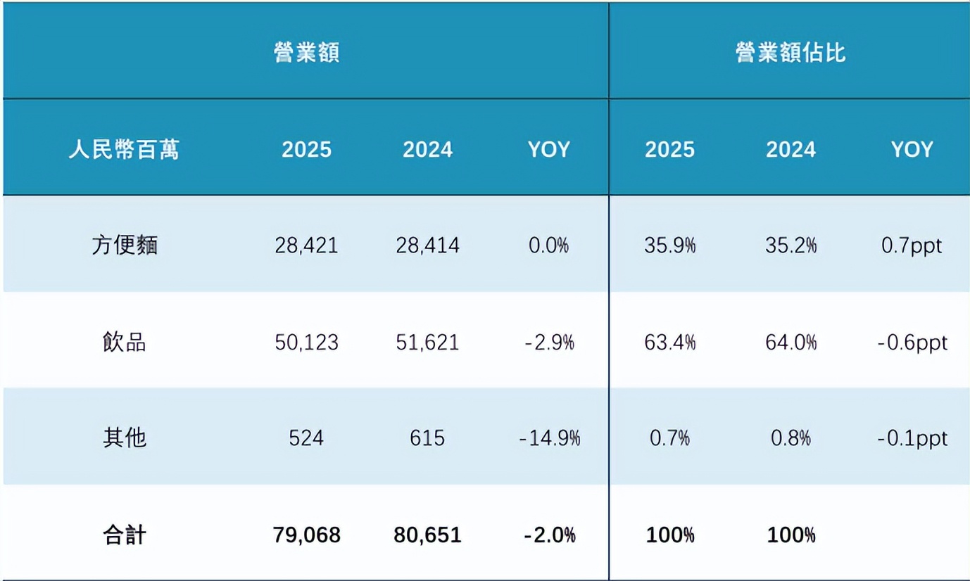 康師傅的營收主要由方便面、飲品兩大業(yè)務組成。2025年,康師傅方便面業(yè)務收益同比微增至284.21億元,占公司總收益35.9%;占比達63.4%的飲品業(yè)務同比下滑2.9%至501.23億元,相較于2024年少了近15億元;其他業(yè)務降幅達14.9%至5.24億元。