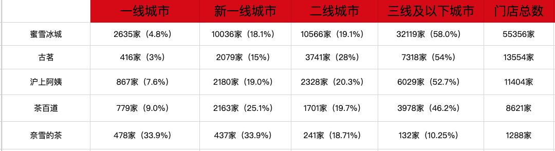 具體來看,下沉市場成為“三巨頭”擴張的主戰(zhàn)場。蜜雪冰城三線及以下城市比例擴大到58%;古茗二線及以下城市門店占比高達(dá)82%,較上年提升2個百分點,其中位于鄉(xiāng)鎮(zhèn)區(qū)域的門店比例進(jìn)一步升至44%;滬上阿姨三線及以下城市門店也同比增長2.3%,占比達(dá)52.7%。
