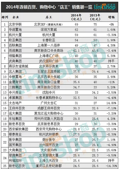 聯(lián)商網(wǎng)零售資訊“聯(lián)商網(wǎng)消息:2014年全國(guó)各地百貨、購(gòu)物中心業(yè)績(jī)逐漸出爐,聯(lián)商網(wǎng)記者對(duì)數(shù)據(jù)進(jìn)行梳理,獨(dú)家盤(pán)點(diǎn)《2014年連鎖百貨、購(gòu)物中心“店王”銷(xiāo)售額一覽》。北京SKP商場(chǎng)(原新光天地)以69億,成為全國(guó)單店業(yè)績(jī)最高門(mén)店,深圳萬(wàn)象城以62億成為萬(wàn)象城店王,名列全國(guó)第二,杭州大廈59億元,全國(guó)排名第三。