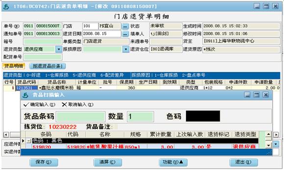 HDWMS系統(tǒng)匹配退貨貨品與退貨申請單相關(guān)信息,較之人工驗(yàn)貨,效率提高、差錯(cuò)率降低,嚴(yán)格退調(diào)庫庫存管理。下圖是門店退貨掃描輸入界面: