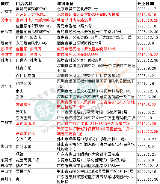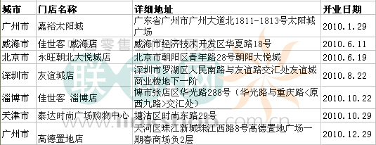 2010年,永旺在內(nèi)地新開(kāi)出7家門(mén)店,以下是詳細(xì)分布: