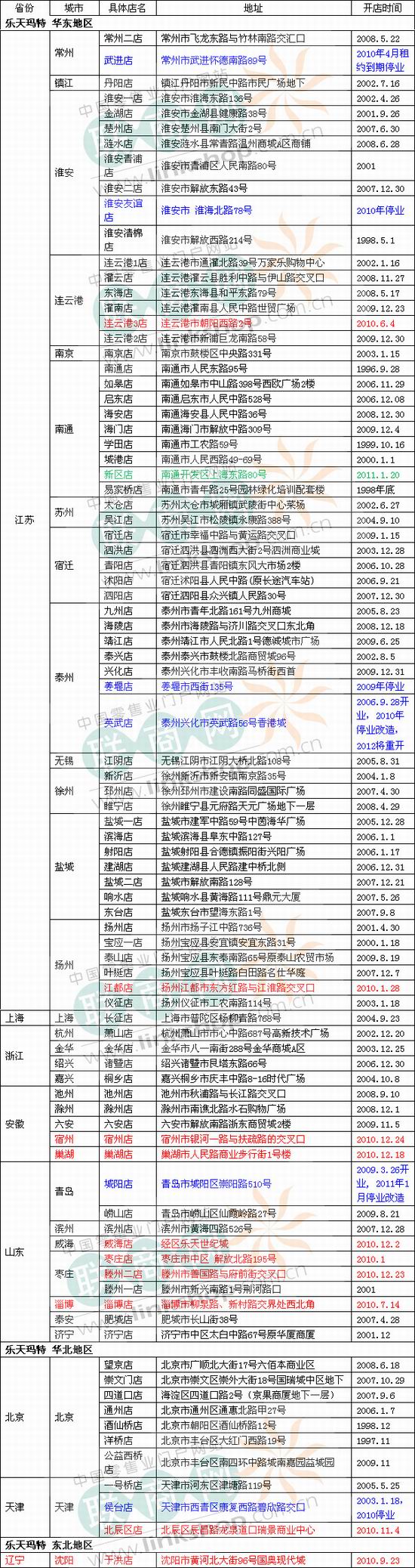 (注:紅色部分為樂(lè)天瑪特2010年新開業(yè)的門店,綠色部分為樂(lè)天瑪特2011年初新開業(yè)的門店,藍(lán)色部分為樂(lè)天瑪特2010年在華停業(yè)或者改造的門店)