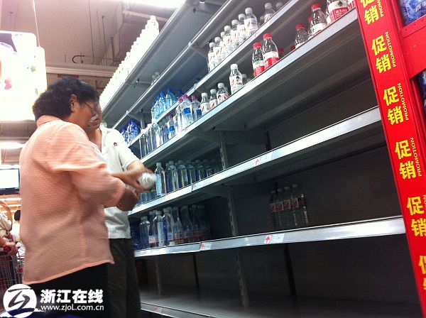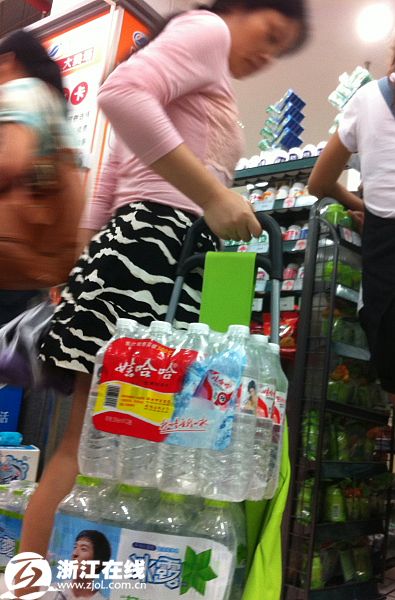 2011年6月6日,杭州城西一家大型超市里,存放大瓶礦泉水的貨架已經(jīng)被“清空”。受4日晚杭州水源地新安江苯酚污染,杭州市民開始趕赴超市搶購飲用水。截至記者發(fā)稿時(shí),超市內(nèi)僅存的礦泉水只有350ML以下容量的瓶裝水和高檔礦泉水。大多數(shù)進(jìn)超市購物的市民,都采購了一定數(shù)量的瓶裝礦泉水。
