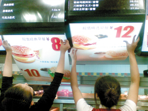 從昨天起,不少來到肯德基就餐的消費(fèi)者發(fā)現(xiàn),這里部分餐食的價(jià)格又提高了。其實(shí),早在28日晚間,肯德基不少門店的工作人員就已經(jīng)開始為此次提價(jià)進(jìn)行著準(zhǔn)備工作。記者28日深夜便在南樓肯德基門店看到,工作人員正在更換柜臺(tái)上方的價(jià)目表,原來標(biāo)價(jià)“6.5元”的位置改成了“7元”,法風(fēng)燒餅的價(jià)目單也從“9元”更換為“10元”。對于提價(jià)工作人員表示:“這次有很多品種要調(diào)價(jià),提價(jià)幅度在5毛到2元之間,從明天(即29日)零時(shí)開始就會(huì)按新價(jià)格賣了。”