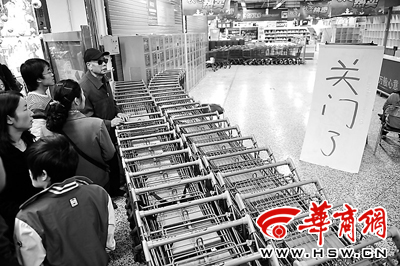 42歲的李彩鳳說(shuō):“我昨天上午到超市買菜,一到超市門口發(fā)現(xiàn)入口處被一排排購(gòu)物車擋著,收銀柜臺(tái)已全部封閉,里面的大招牌上寫著:關(guān)門了,經(jīng)營(yíng)了這么多年,怎么突然就關(guān)門了?”