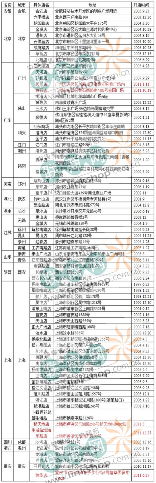 聯(lián)商網(wǎng)之前統(tǒng)計(jì)卜蜂蓮花的有關(guān)數(shù)據(jù)截止時間為2011年12月26日。因12月27日淮海東路的卜蜂蓮花生活站開業(yè),卜蜂蓮花又增加一門店。特此,聯(lián)商網(wǎng)小編更新了有關(guān)數(shù)據(jù),如有遺漏,請批評指正。