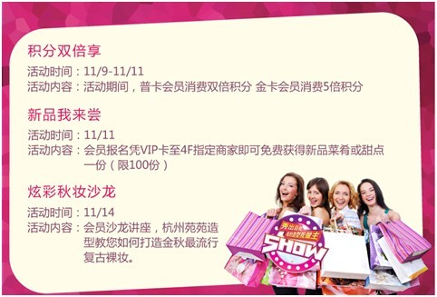 會(huì)員是銀泰城的尊貴顧客,擁有銀泰城承諾的專享特權(quán),在集團(tuán)慶期間,銀泰城特別針對會(huì)員推出了系列專享活動(dòng),不僅在吃貨節(jié)期間,會(huì)員可憑會(huì)員卡參加免費(fèi)試吃活動(dòng)(前100名),還可享受“普卡會(huì)員消費(fèi)雙倍積分,金卡會(huì)員消費(fèi)5倍積分”的尊享禮遇。為了能夠更好的為會(huì)員提供增值服務(wù),銀泰城還將于11月14日舉行以“絢彩秋妝”為主題的會(huì)員專享沙龍,沙龍將邀請?jiān)吩吩煨褪紫O(shè)計(jì)師親身為您打造屬于你的秋妝造型。