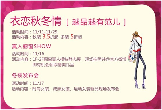 11月16日,隨著銀泰百貨集團(tuán)慶的正式啟幕,銀泰城將為奉化市民呈現(xiàn)一場充滿夢幻、時(shí)尚的繽紛盛宴,櫥窗真人秀奉化銀泰城首度上演,穿著華麗的真人模特,將帶來2012最新的潮流風(fēng)尚,她們抑或是童話中的精靈,閃動(dòng)著睫毛恬靜、夢幻,抑或是巴黎街頭的女郎,扭動(dòng)著身姿優(yōu)雅、時(shí)尚。如果你還覺得意猶未盡,11月17日,銀泰城還將奉上2012奉化首屆冬裝發(fā)布會(huì),一天三場,分別傳遞時(shí)尚絢彩、成熟雅致、動(dòng)感活力的流行趨勢。