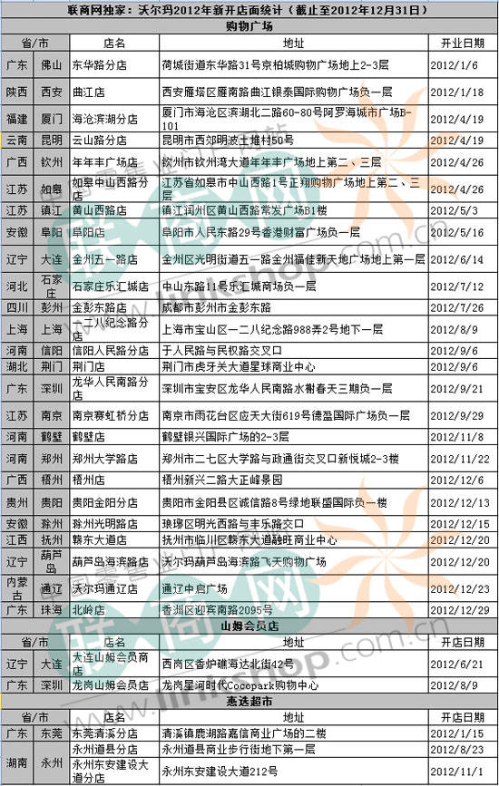 一、沃爾瑪2012年在華內(nèi)地新開(kāi)門店(30家):