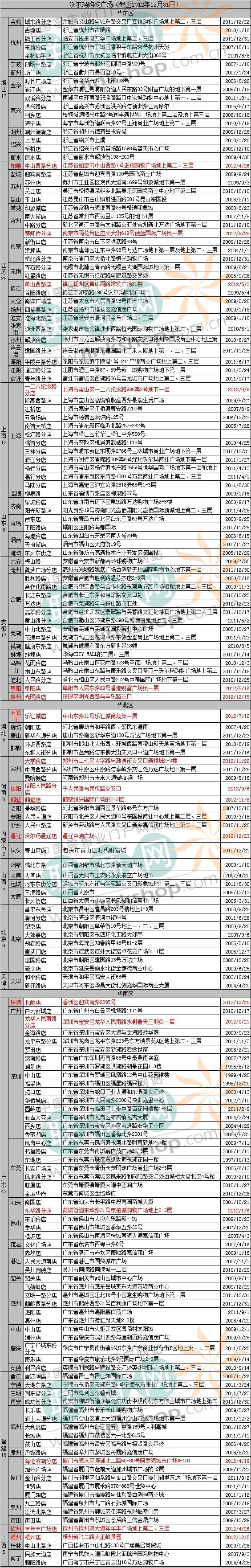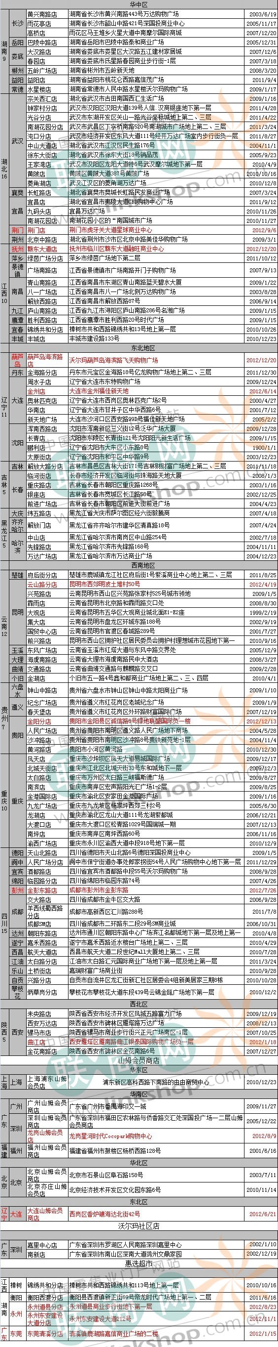 截止2012年12月31日,沃爾瑪2012年在華新開(kāi)店30家,其中:廣東5家,河南3家,江蘇3家,遼寧3家,安徽2家,廣西2家,湖南2家,湖北1家,河北1家,陜西1家,福建1家,貴州1家,江西1家,內(nèi)蒙古1家,上海1家,四川1家,云南1家。具體分布如下: