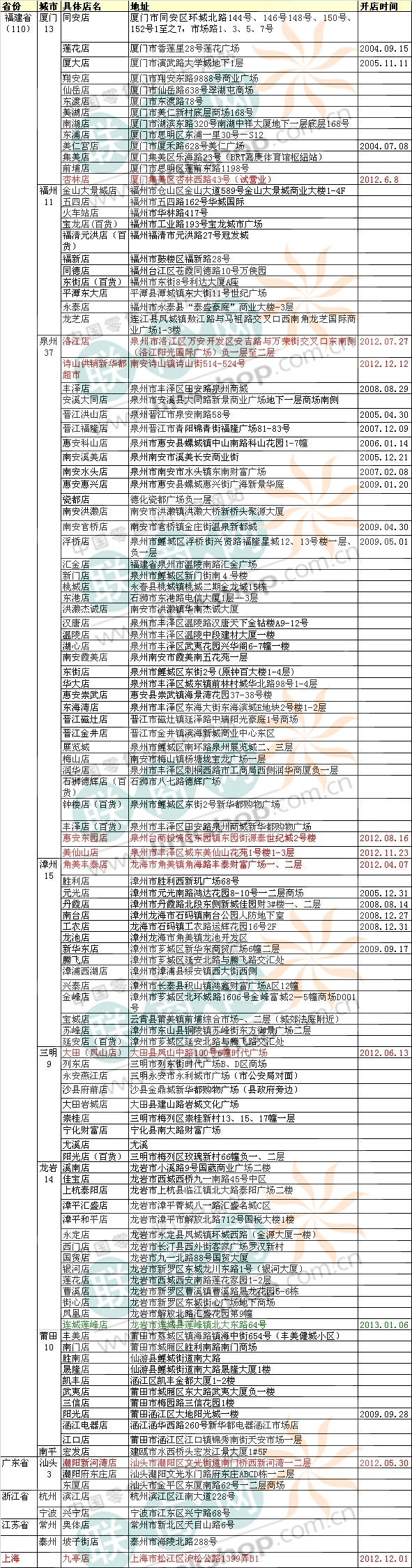 一、新華都2012年新開(kāi)門(mén)店具體分布(9家)
