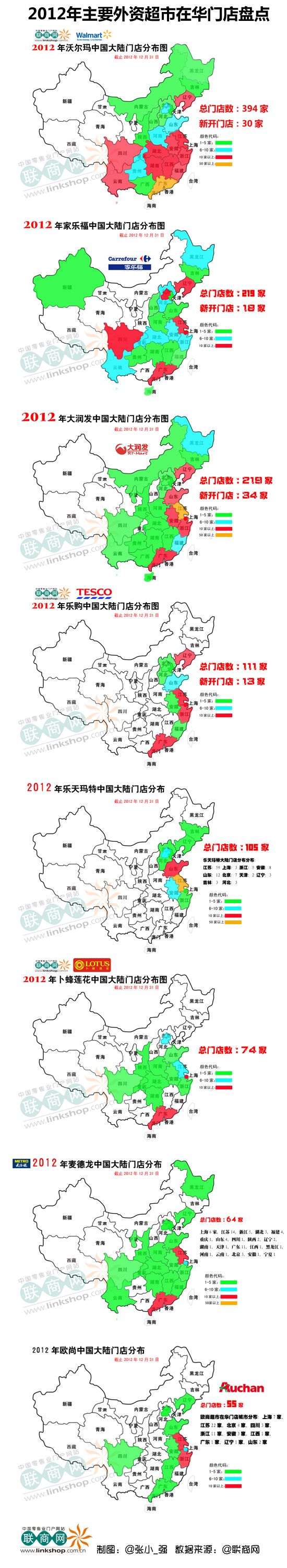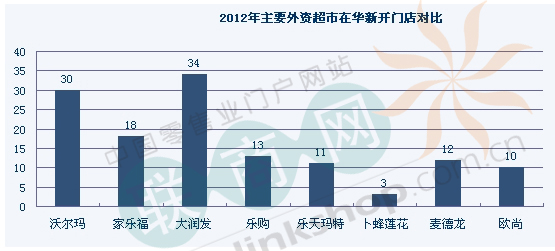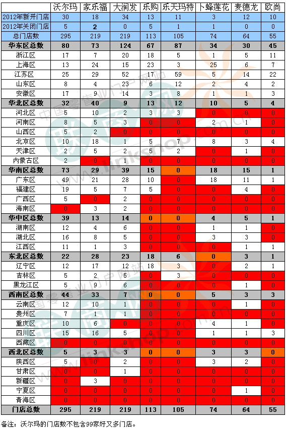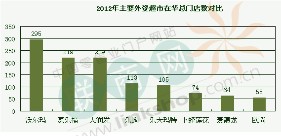 沃爾瑪等外資超市2012年在華門店布局對比
