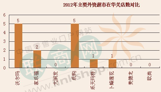 家樂福:家樂福2012年在華新開門店18家,截至2012年12月31日,家樂福中國內地門店總計219家(總關閉門店為8家,其中2012年新關閉門店為2家,關閉門店數不包括在總門店數中)。門店數量被大潤發(fā)趕超,外資超市第二的地位已經不保!詳情點擊】