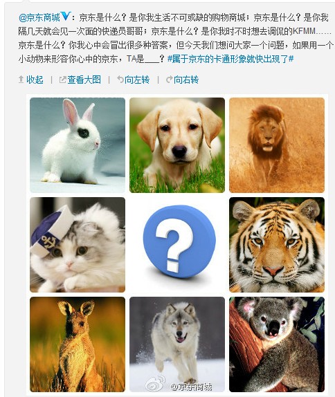 今天,京東商城在微博征集網(wǎng)友意見,用小動物來形容心中的京東。雖說是征集意見,京東或早已經(jīng)有了自己的答案。