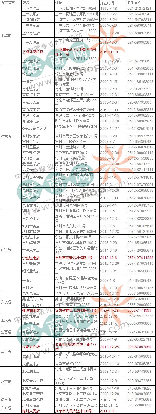 歐尚超市在華門店分布表(標紅為2013年1月1日后新增門店)