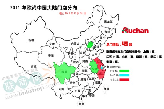 截止2013年底,歐尚在華門店分布情況具體為:江蘇22家、浙江12家、上海8家、北京4家、四川4家、安徽4家,山東2家,江西1家,廣東1家,遼寧1家。2013年新增的4家門店分別分布在上海、浙江寧波、安徽蚌埠和四川成都。