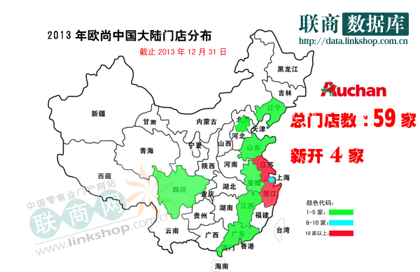據(jù)聯(lián)商網(wǎng)統(tǒng)計,2013年歐尚超市在華新開門店4家,截止到2013年12月31日,門店總數(shù)達59家。與上一年相比,其在中國市場拓展開店的速度進一步放緩。