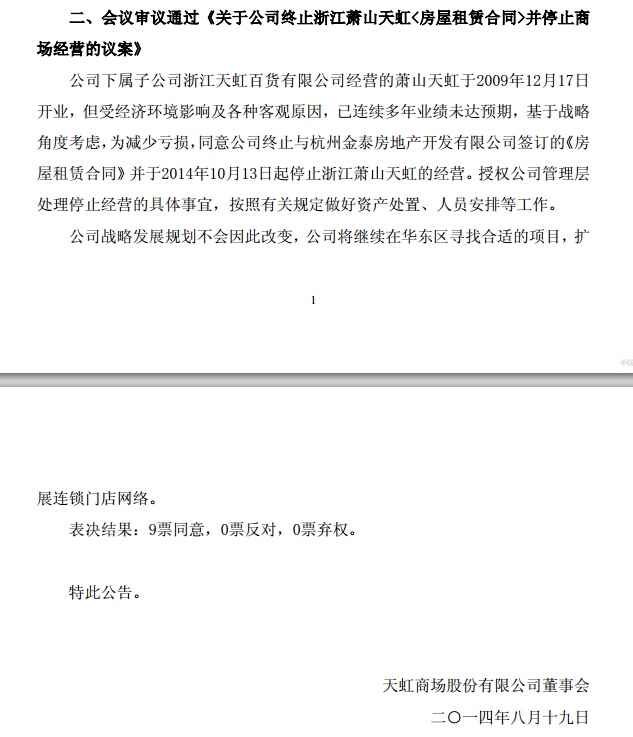 杭州蕭山天虹百貨將于10月13日關(guān)門停業(yè)