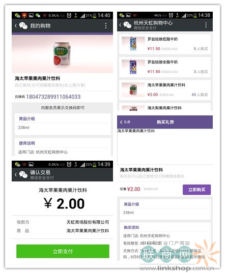 聽(tīng)說(shuō)天虹和騰訊合作,開(kāi)發(fā)了微信支付,小編進(jìn)超市就先去找微信產(chǎn)品。不過(guò)令小編失望的是,微信特價(jià)商品只有幾款,原價(jià)5元的進(jìn)口飲料,微信價(jià)賣(mài)2元,流程見(jiàn)下圖: