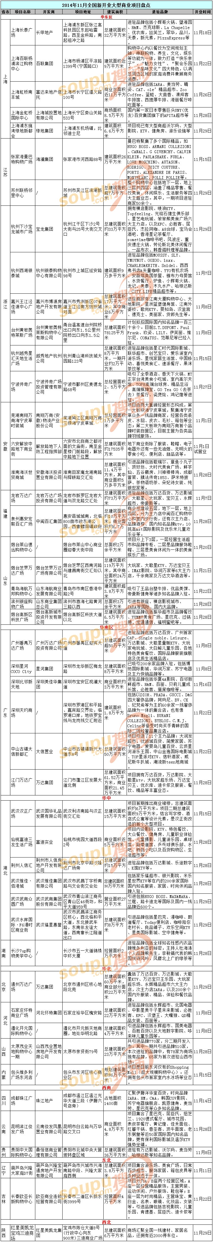 聯(lián)商網消息:據搜鋪網報道,對于商業(yè)地產而言,每天都有新的競爭對手出現(xiàn)。尤其是在年末的時候,更是商業(yè)項目開業(yè)的高峰期。根據搜鋪網對2014年11月份開業(yè)商業(yè)項目進行統(tǒng)計,發(fā)現(xiàn)這個初冬不太冷,全國本月新開業(yè)項目將進50個。萬達、茂業(yè)、銀泰、歐亞等均有新項目入市。