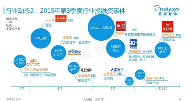 所以今天我們看到當(dāng)這樣一些公司在市場(chǎng)上運(yùn)營(yíng),我非常高興汽車商會(huì)做了很重要的決策,這里面有非常完整的關(guān)于互聯(lián)網(wǎng)公司的進(jìn)化和玩法。在資本市場(chǎng)上可能會(huì)出現(xiàn)獨(dú)角獸的企業(yè),可能他們將來(lái)會(huì)成為過(guò)10億美金級(jí)的公司,比如途虎、人人車、誠(chéng)易拍,還包括現(xiàn)在的優(yōu)信、51汽車等。當(dāng)你們現(xiàn)在還在埋頭苦干,在你們的店里面等顧客上門(mén)的時(shí)候,其實(shí)互聯(lián)網(wǎng)已經(jīng)把整個(gè)市場(chǎng)攪得翻天覆地。其實(shí)大量的資金都在大規(guī)模地殺進(jìn)來(lái)。剛出爐的易觀數(shù)據(jù)顯示,我們看到人人車、騰訊跟雷軍投了大概8千多萬(wàn)進(jìn)去,12月底273經(jīng)過(guò)二手車的交易平臺(tái)拿到1.6億,現(xiàn)在越來(lái)越多的資本在殺進(jìn)汽車行業(yè)。對(duì)我們今天所有的這些實(shí)體店來(lái)說(shuō),不管你是做保養(yǎng)還是做4S店的,還是街邊的碎片化的服務(wù)小店,今天都面臨一個(gè)新的思考,我們是不是坐在這樣一個(gè)船上,這個(gè)船叫什么?泰坦尼克。