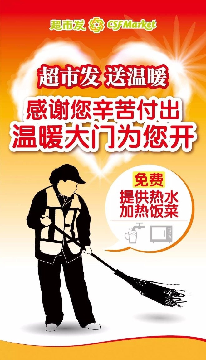 記者現(xiàn)場(chǎng)發(fā)現(xiàn)在超市發(fā)每家門店,顯著位置都貼著“免費(fèi)提供熱水,加熱飯菜”的宣傳畫,用行動(dòng)感染消費(fèi)者對(duì)環(huán)衛(wèi)工人獻(xiàn)愛心,對(duì)保護(hù)環(huán)境更加重視!