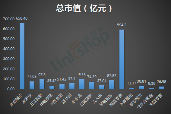 截止5月23日交易結(jié)束,15家超市上市企業(yè)總市值1952.07億元,平均市值130.14億元,但僅有永輝超市、高鑫零售、步步高等3家企業(yè)市值超百億。永輝超市和高鑫零售市值遠(yuǎn)高于其他13家企業(yè),分別高達(dá)658.40億元,594.20億元,兩家企業(yè)市值總和超過1200億,已經(jīng)超過15家企業(yè)總市值的一半,這同時(shí)也拉高了平均市值水平。近日來永輝超市股價(jià)的持續(xù)上漲,同時(shí)高鑫零售股價(jià)受挫,永輝超市已超越高鑫零售成為15家企業(yè)中市值最高的企業(yè),并逐漸拉開差距。此外,卜蜂蓮花、北京京客隆市值不足20億,其中北京京客隆僅為8.39億,在所有15家企業(yè)中市值最低。