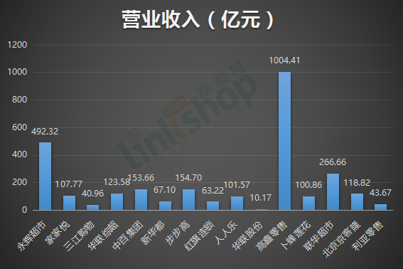 15家超市上市企業(yè)2016年實(shí)現(xiàn)營收2849.47億元,相比2015年的2764.52億元,增加84.95億元,增幅超3%。平均營收189.96億元,其中10家企業(yè)營收規(guī)模超過100億,營收最多的高鑫零售已超過1000億,最少的華聯(lián)股份僅有10億左右,兩者差距高達(dá)100倍。此外,8家企業(yè)營收實(shí)現(xiàn)正增長,永輝超市、紅旗連鎖漲幅最大,均超15%;7家企業(yè)營收仍處于負(fù)增長,華聯(lián)股份跌幅最大,超14%。