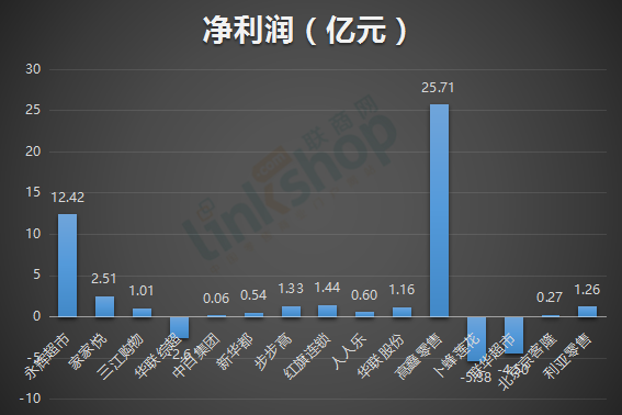 盈利最多:高鑫零售2016年凈利潤25.71億元,較去年增長5.2%,在所有15家企業(yè)中盈利最高,并處于絕對領(lǐng)先優(yōu)勢。其次是永輝超市,盡管12.42億元的凈利只有高鑫零售的一半,但也遠(yuǎn)遠(yuǎn)高于其他13家企業(yè),而且與2015年的6.05億元相比,2016年凈利增加6.37億元,增幅高達(dá)105.18%。這主要是永輝超市除規(guī)模體系內(nèi)最大的老區(qū)重慶為公司整體利潤增長奠定基礎(chǔ)外,新進(jìn)省份山西開業(yè)3個(gè)月便實(shí)現(xiàn)盈利;北京和福建作為成熟區(qū)域?yàn)楣据斔瓦^億的利潤;此外,上海、江蘇和黑龍江扭虧為盈,天津、廣東、遼寧和吉林都不同程度的減虧。