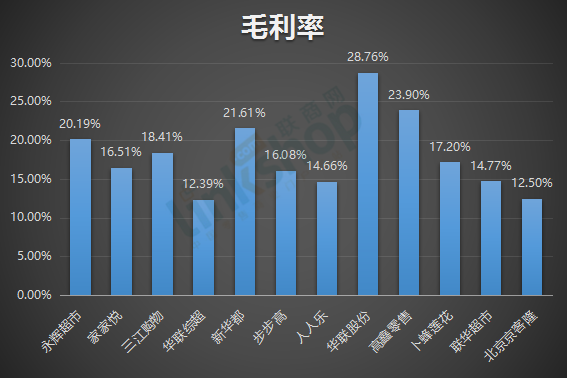 有數(shù)據(jù)統(tǒng)計(jì)的12家超市上市企業(yè)平均綜合毛利率為18.08%,其中華聯(lián)股份、高鑫零售、新華都、永輝超市等四家企業(yè)綜合毛利率均超過20%,華聯(lián)股份最高,達(dá)到28.76%,但其主要是租賃及物業(yè)管理毛利率。6家企業(yè)毛利率實(shí)現(xiàn)增長,其中永輝超市和三江購物增長較為明顯,接近2%;卜蜂蓮花和聯(lián)華超市相比去年沒有變化;其余4家企業(yè)毛利率較去年微降。