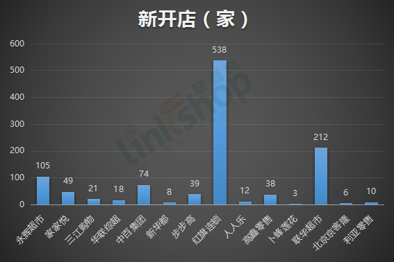 新開店最多:紅旗連鎖在做好原有門店穩(wěn)固經(jīng)營的同時(shí),積極拓展門店,不斷完善商圈覆蓋。2016年新開門店達(dá)到538家,是15家企業(yè)中門店拓展數(shù)量最多的。其次是永輝超市,2016年新開門店105家(含會(huì)員店、超級物種及優(yōu)選店)。截止2016年12月31日,永輝超市共擁有487家門店,經(jīng)營面積427.67萬平方米。