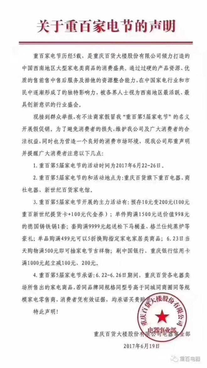 以下為重百家電節(jié)的聲明: