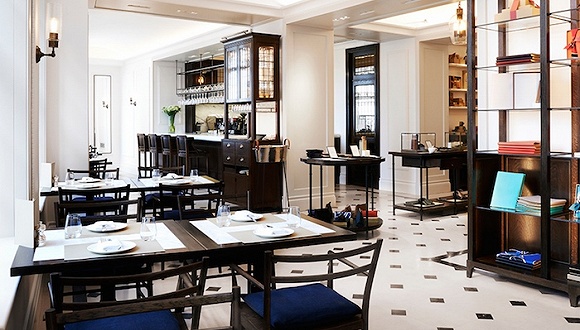光滑的云灰?guī)r大理石、白色金屬百葉窗和清晰明亮的燈管詮釋了Thom Browne心中獨(dú)特的美式美學(xué),將他對美國1950年代的情懷生動地帶入中國。室內(nèi)家具裝潢依舊選擇了50年代標(biāo)志性設(shè)計(jì)師Edward Wormely for Dunbar, Jacques Adnet, Harvey Probber和Paul McCobb的家具作品。
