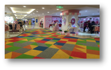 第一百貨內(nèi)最先讓我感受到設計者的創(chuàng)意是在四樓童裝區(qū),雖然四樓不僅僅是孩子們的天堂,還有部分女裝區(qū)和餐飲區(qū),但是明亮的七巧板形狀的防滑地面巧妙地將成人和兒童區(qū)域分隔開來,非常有意思。童裝區(qū)域圍繞一塊玩具區(qū)展開,我已經(jīng)可以想象到到過年時對新衣服不感興趣的孩子們和同齡人在玩具區(qū)徜徉的場景了。