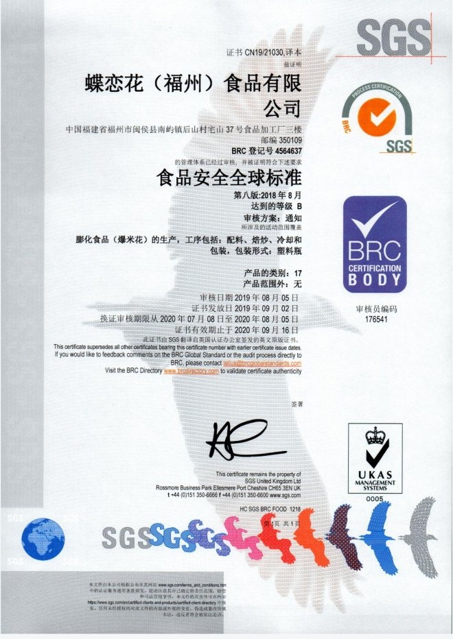 蝶戀花食品通過(guò)BRC認(rèn)證 打造全球標(biāo)準(zhǔn)的中國(guó)爆米花品牌