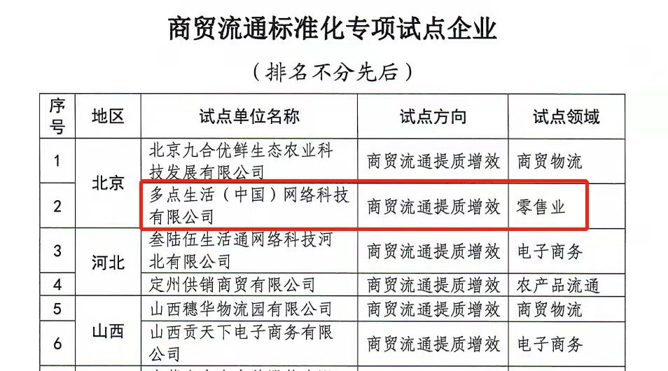日前,商務(wù)部會同市場監(jiān)管總局聯(lián)合公布了國家級服務(wù)業(yè)標(biāo)準(zhǔn)化試點(diǎn)(商貿(mào)流通專項)名單,在企業(yè)自愿申報、地方擇優(yōu)推薦的基礎(chǔ)上,經(jīng)專家層層評審和社會公示,一站式全渠道數(shù)字零售解決方案服務(wù)商多點(diǎn)Dmall成功入選。據(jù)悉,本次共入選95家首批試點(diǎn)企業(yè),北京地區(qū)僅兩家,其他地區(qū)入圍的企業(yè)名單有盒馬、蘇寧物流、紅旗連鎖、銀川新華百貨連鎖超市、大商集團(tuán)等。