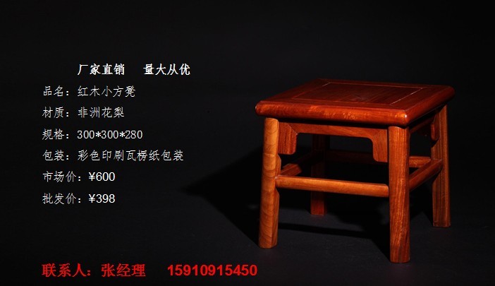 品號:BJD-010 品名:紅木小方凳 材質(zhì):非洲花梨 規(guī)格:300*300*280 包裝:彩色印刷瓦楞紙包裝